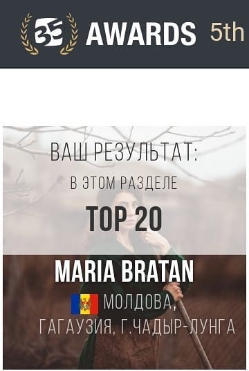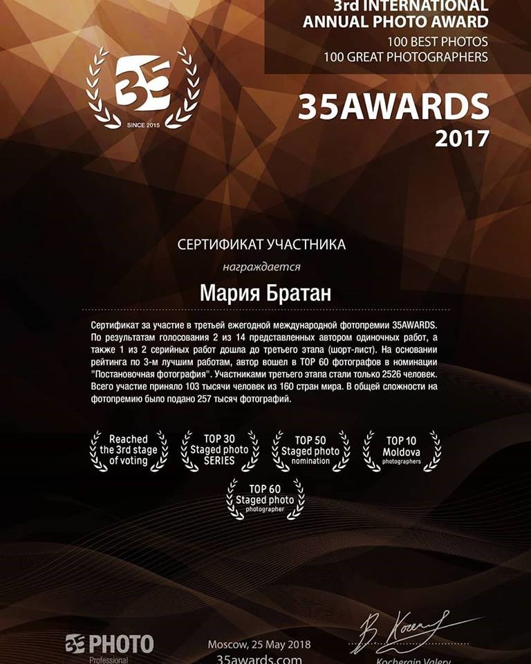 "CreativityLab" в лице фотографа Марии Братан приняла участие и получила заслуженный сертификат в третьей ежегодной международной фотопремии «35AWARDS 2017». Это было первое и не последнее участие в конкурсе,где Мария входила в топ 10 и 20 фотографов по Молдове, в топ 60 фотографов из более 150 стран мира.
